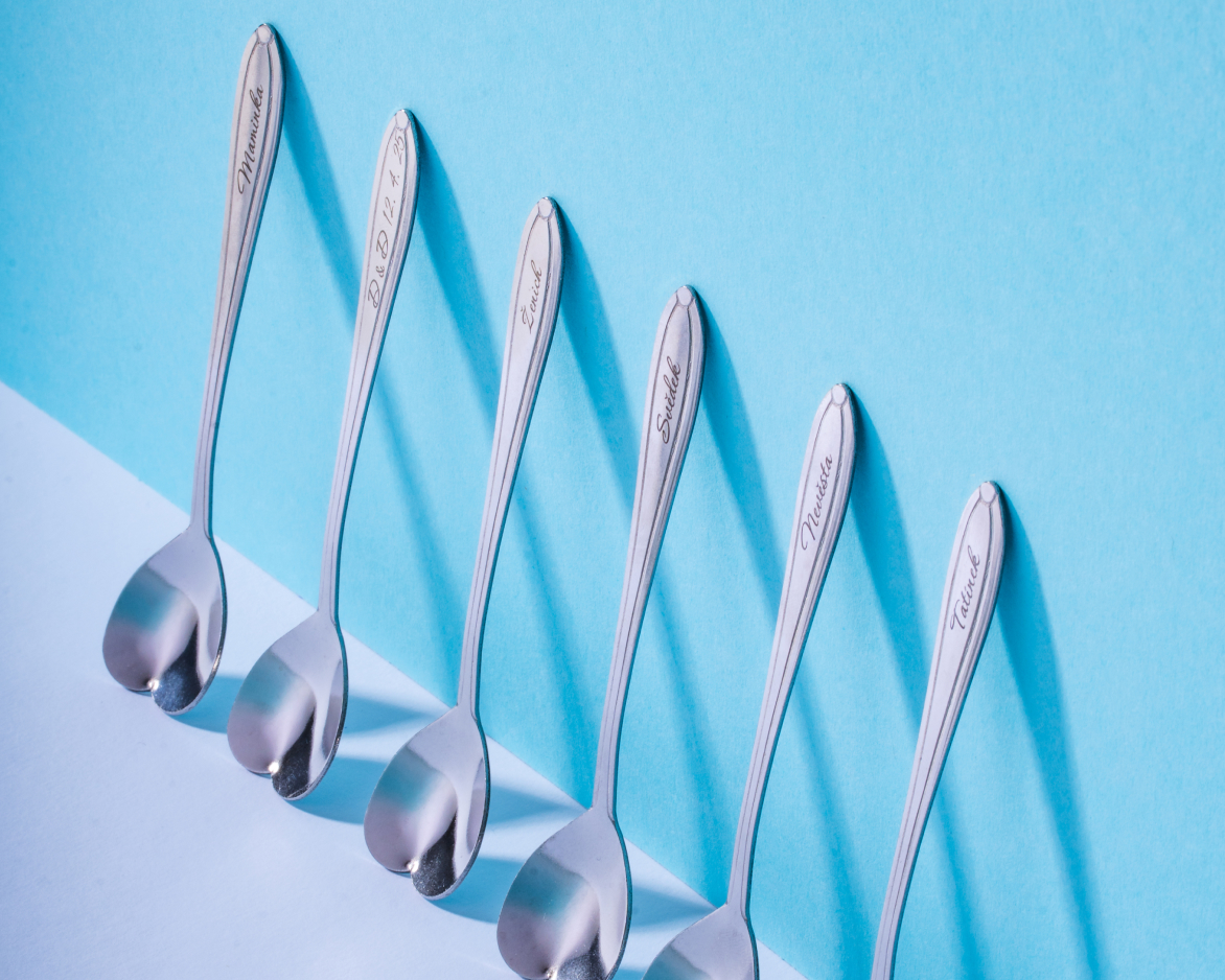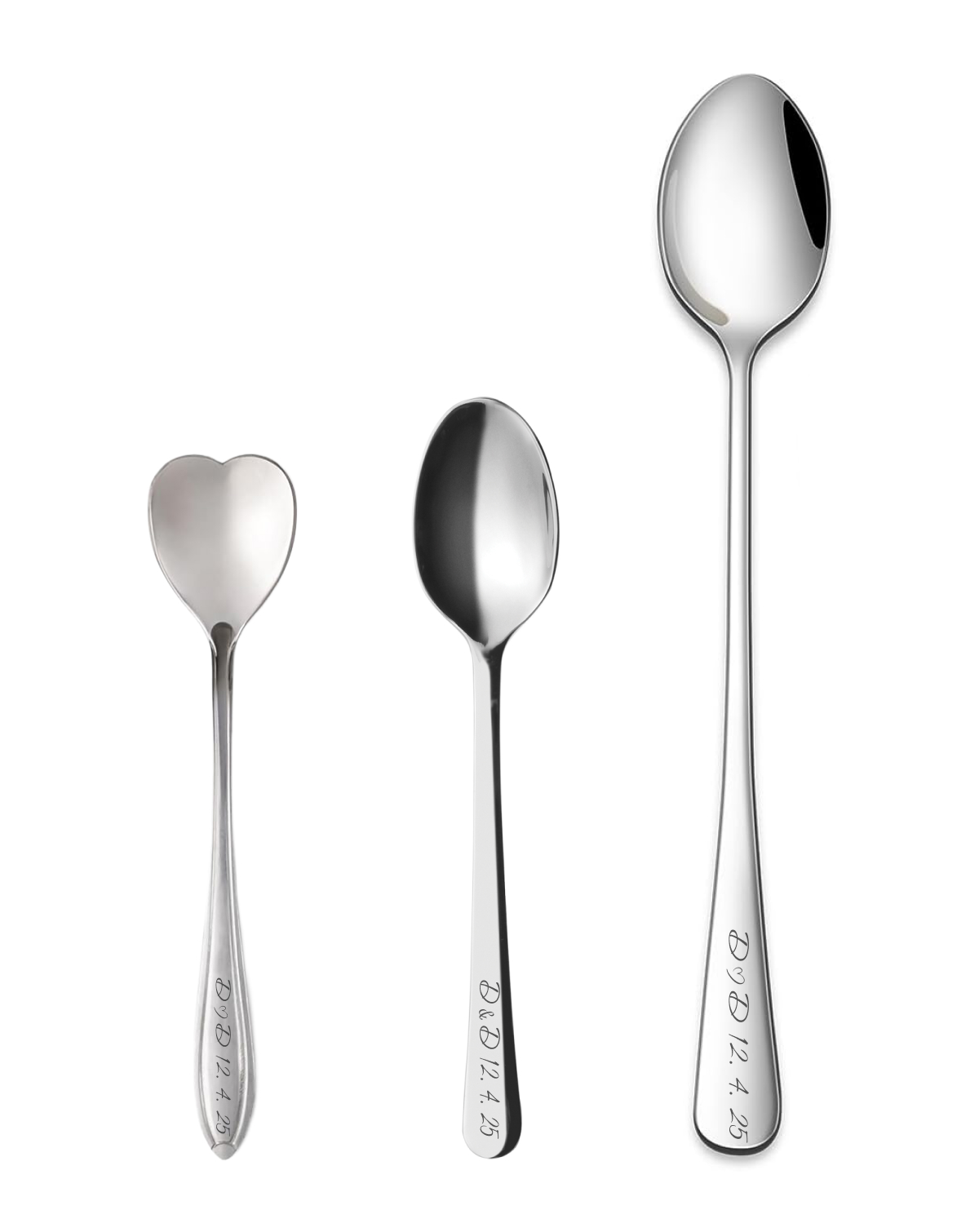 Gravírované nerezové příbory na výběr ve 3 typech. Na výběr je mezi dvěmi lžičkami na kávu / čaj a latté lžičkou.